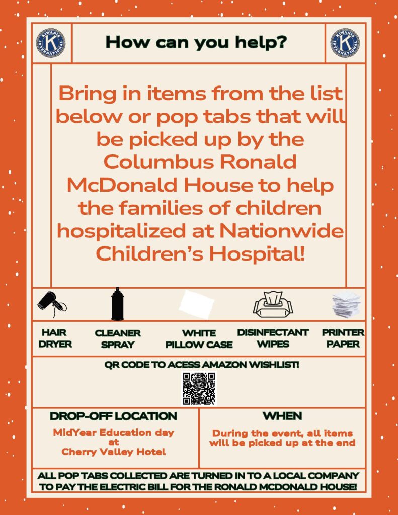 As part of the First Family Project, the Ohio District of Kiwanis has partnered with Ronald McDonald House Charities. Please consider bringing pop tabs and/or items from their wishlist.